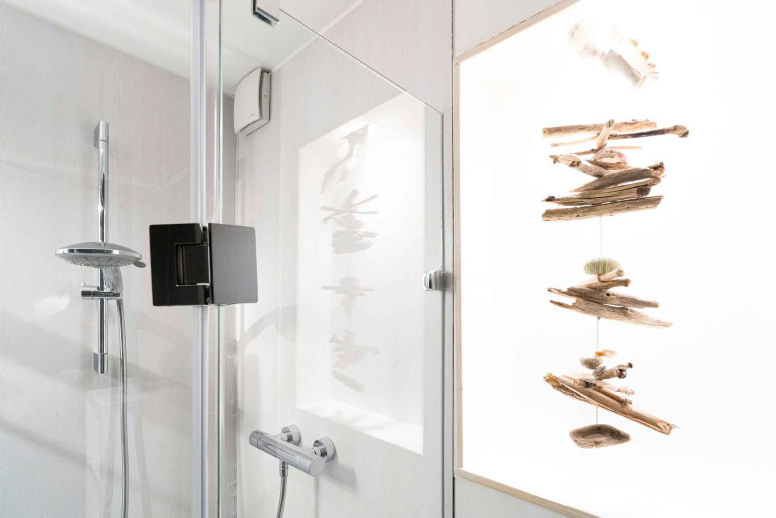 - Fünfeckige Duschwanne, fast ebenerdig (nur 5 cm Höhenunterschied)