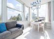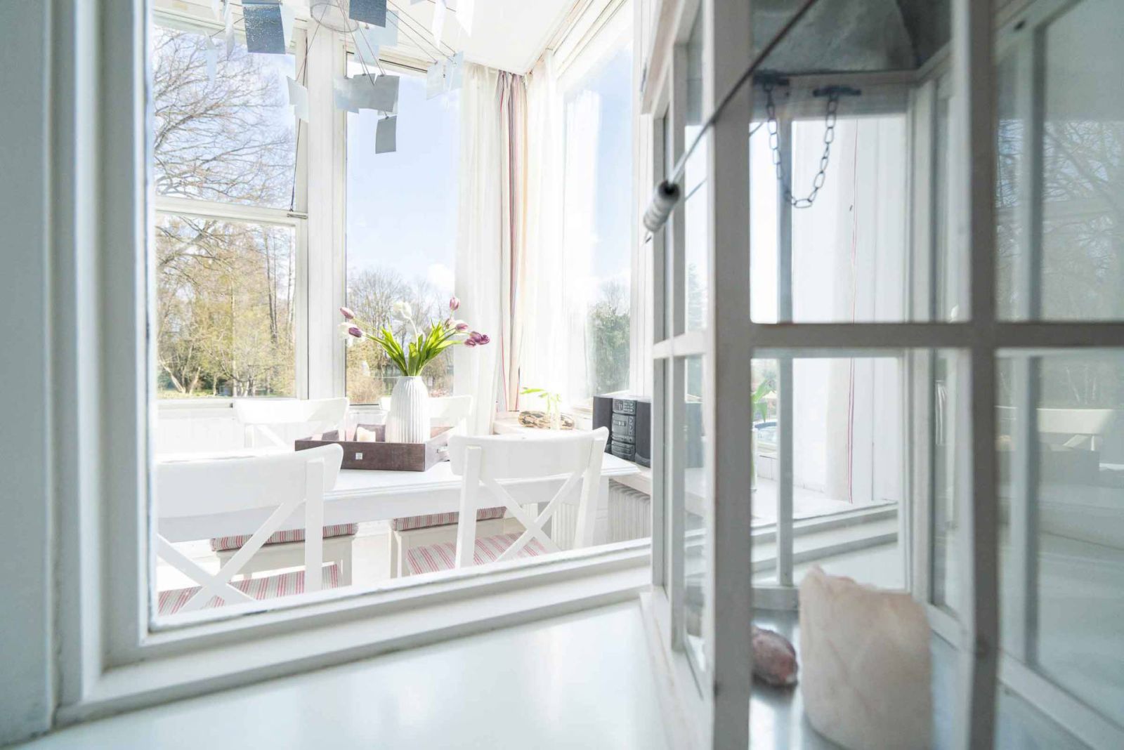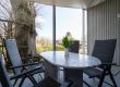 Die großflächig verglaste Veranda ist lichtdurchflutet und einladend. Hier findest du den Esstisch sowie eine Stereoanlage, um deine Mahlzeiten in entspannter Atmosphäre zu genießen.