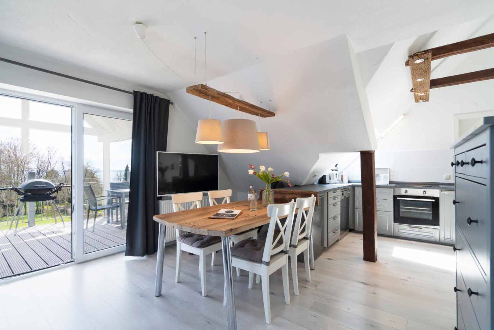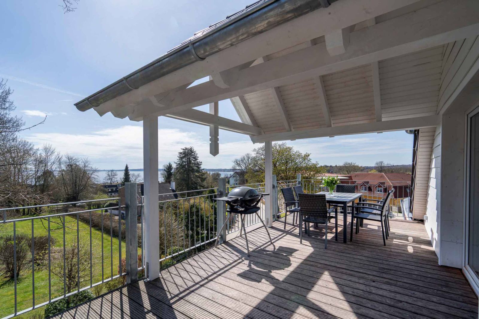 Eine großzügige Dachterrasse bietet einen herrlichen Blick über die Lübecker Bucht. Sie ist mit einem großen Tisch, sechs Stühlen und einem elektrischen Weber-Grill ausgestattet, perfekt für gemütliche Abende im Freien.