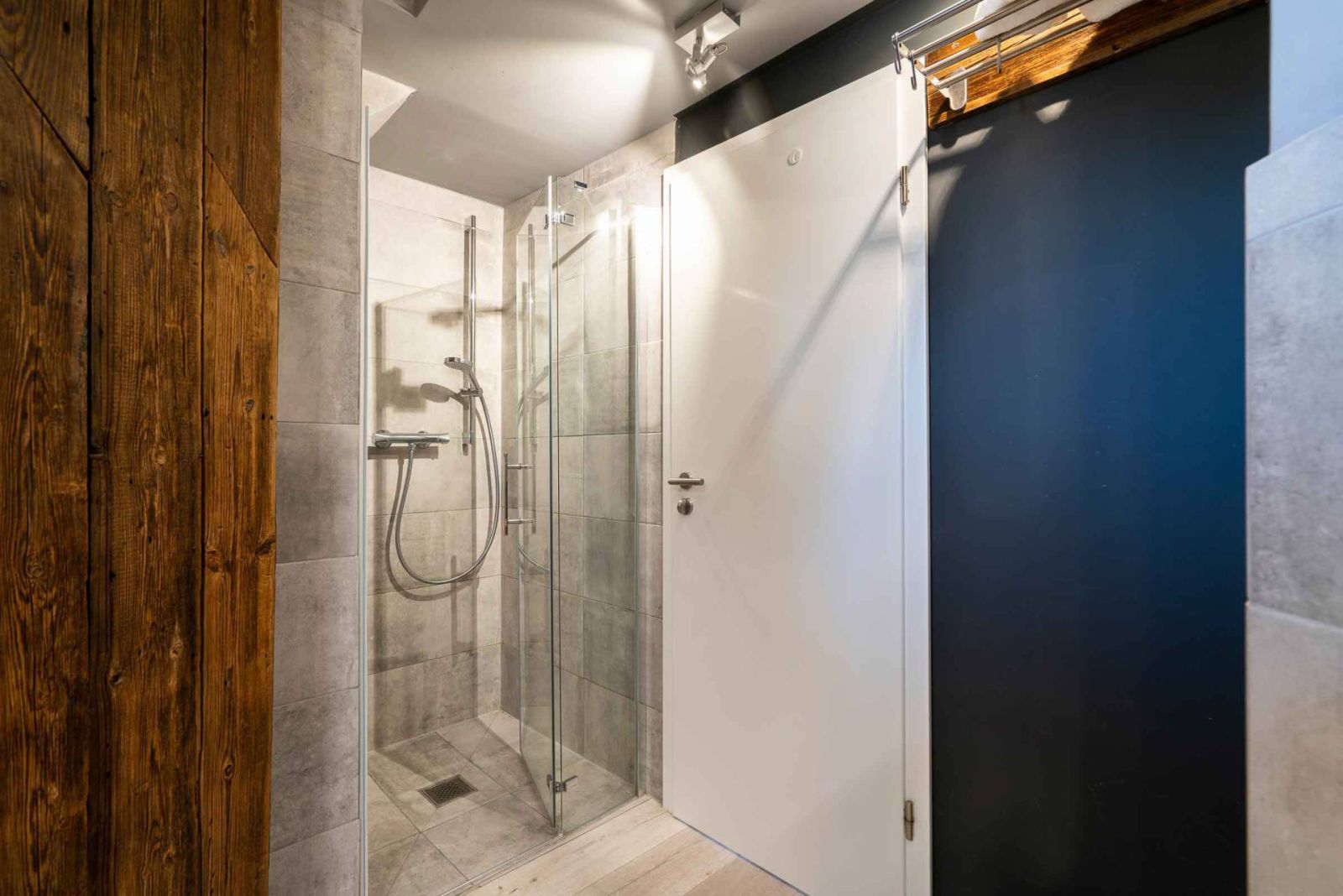 Das Duschbad ist mit einer integrierten Sauna ausgestattet, ideal für entspannende Momente nach einem Tag am Meer.