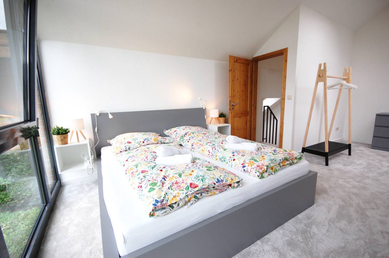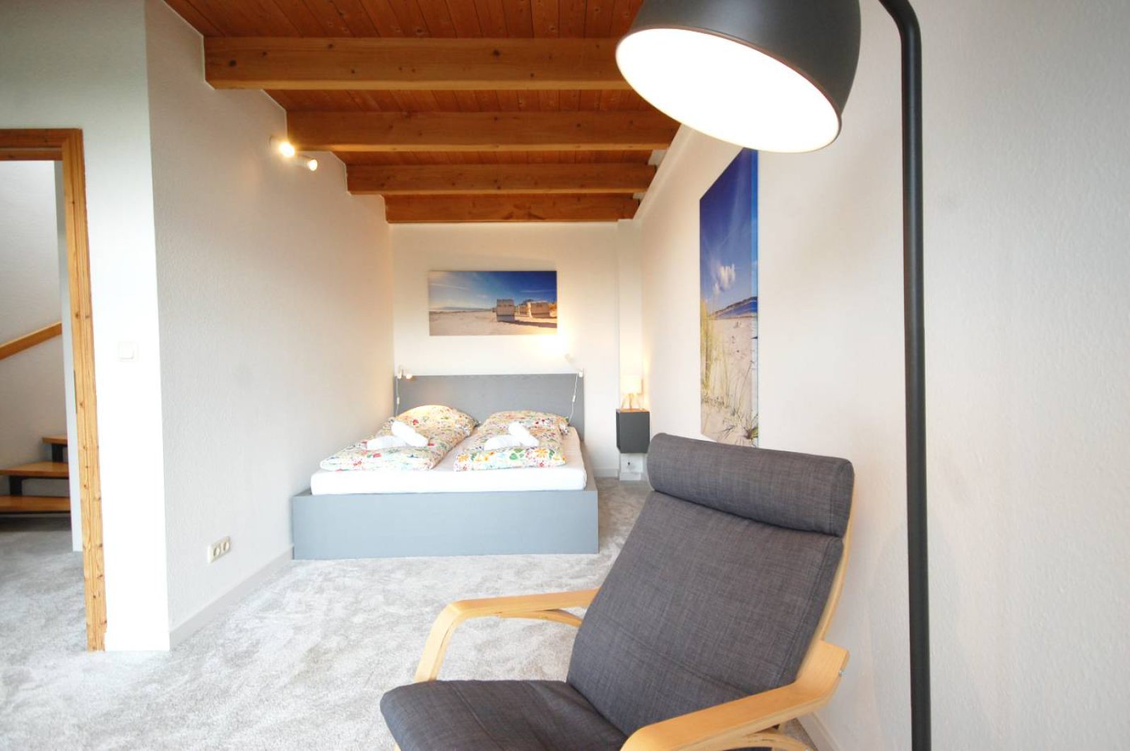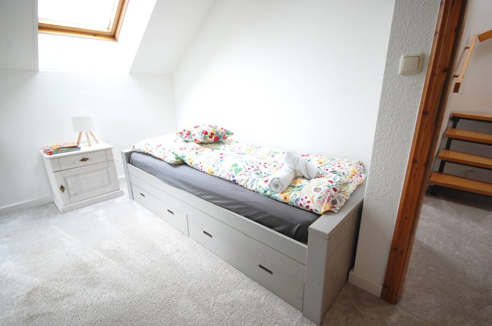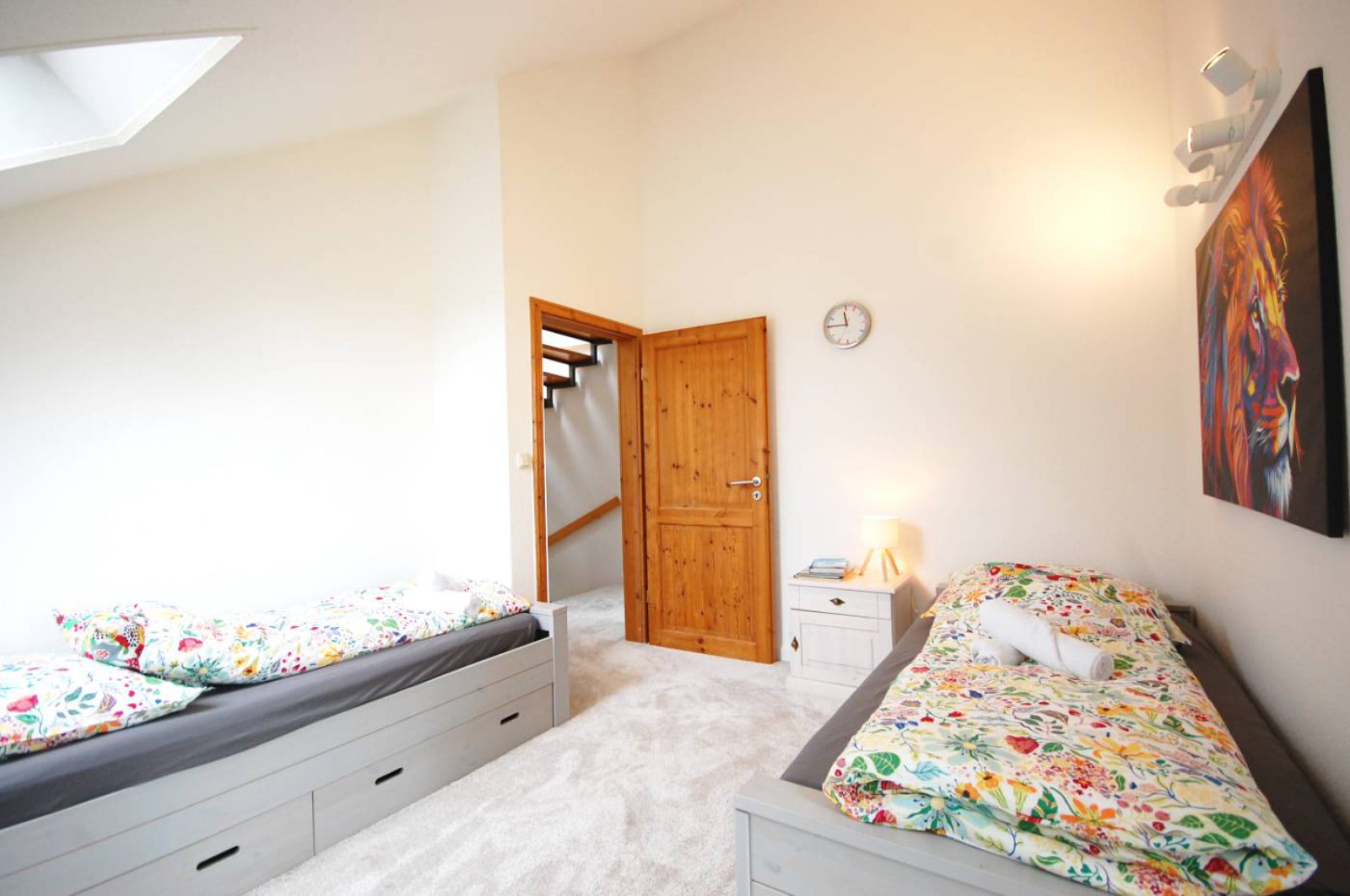 Zweites Obergeschoss: Ein gemütliches Dachzimmer mit weiterem Doppelbett und Schreibtisch bietet Rückzugsraum zum Lesen, Arbeiten oder Entspannen.