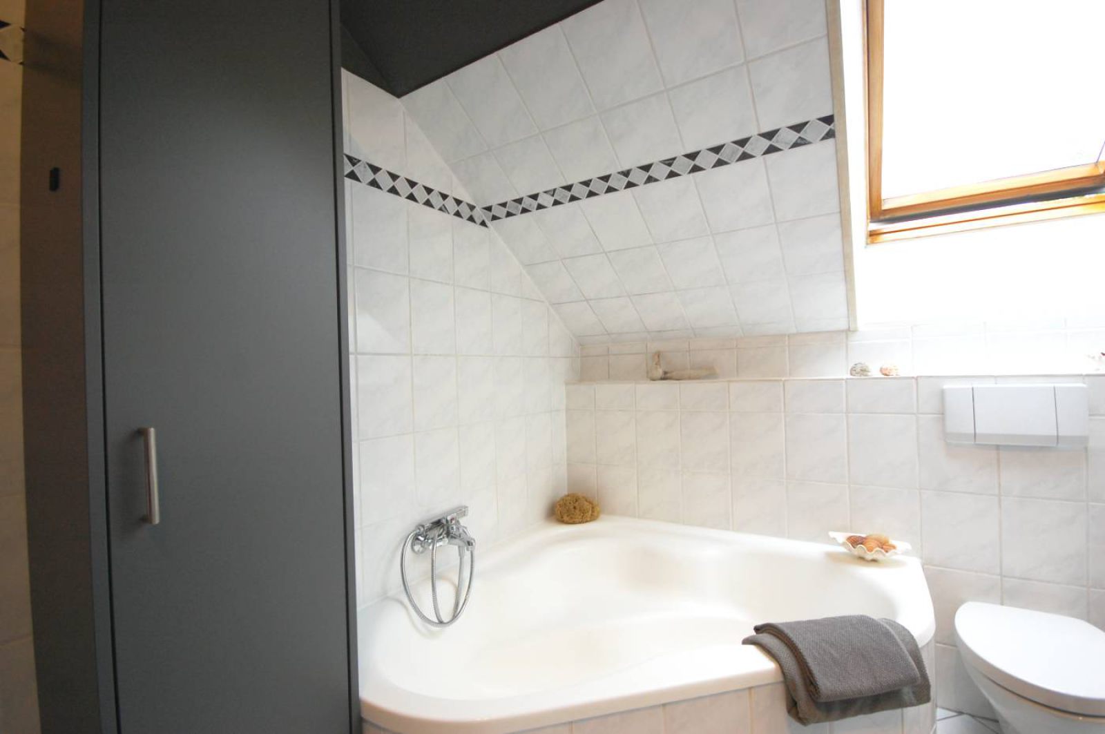 Erstes Obergeschoss: Hier erwarten Sie ein Schlafzimmer mit Doppelbett und Balkon, ein weiteres Schlafzimmer mit zwei Einzelbetten sowie ein großzügiges Badezimmer mit Badewanne, Dusche und Tageslichtfenster.